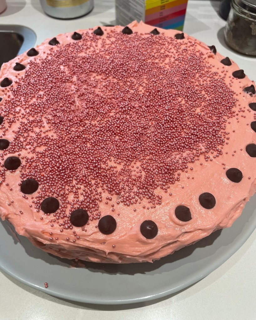 And that is how you make a valentine’s cake . If you were wondering about the colour and how we got that pink is we used Christmas red and a bit of pink and lemon yellow.